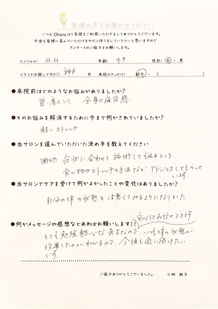 いつも体の状態が改善したのがわかるので、今後も通い続けたいです