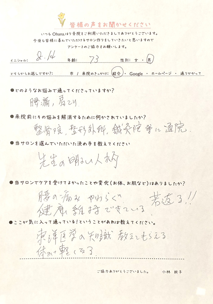 腰の痛みやわらぐ、若返る!!健康維持できている。